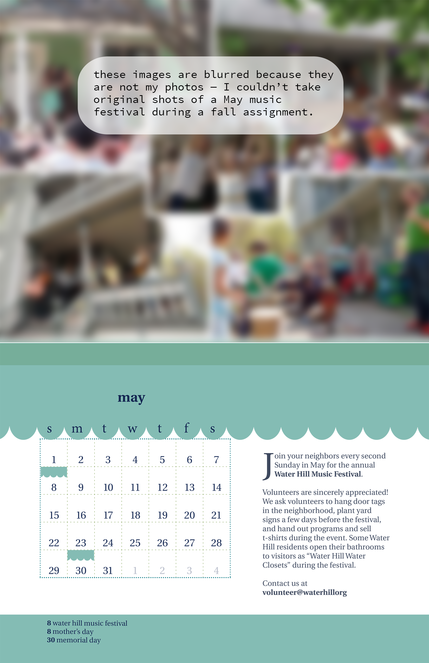 The assignment: choose a local neighborhood and design an appropriate identity for it, with a logo, and promotional materials. Water HiIl is a charming and eclectic neighborhood in Ann Arbor, MI.